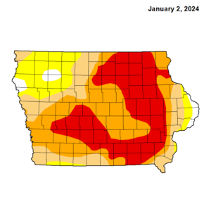 This week’s drought map is the first since August 15, 2023, there was no extreme drought registered in northeast Iowa. The first presence of extreme drought came with the August 22, 2023, map with sections of Floyd, Chickasaw, Bremer, Butler and Grundy counties all rated in D3/extreme drought.