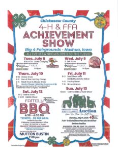 For a complete list of activities for the Chickasaw County 4-H and FFA Achievement Show, July 8th through July 13th, see below or visit Chickasaw County 4-H on Facebook.