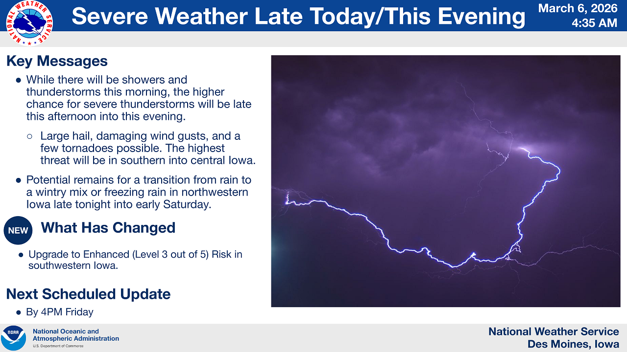 Parts of southwestern Iowa are under an Enhanced Risk (Level 3 out of 5) for severe weather, meaning numerous severe storms are possible.