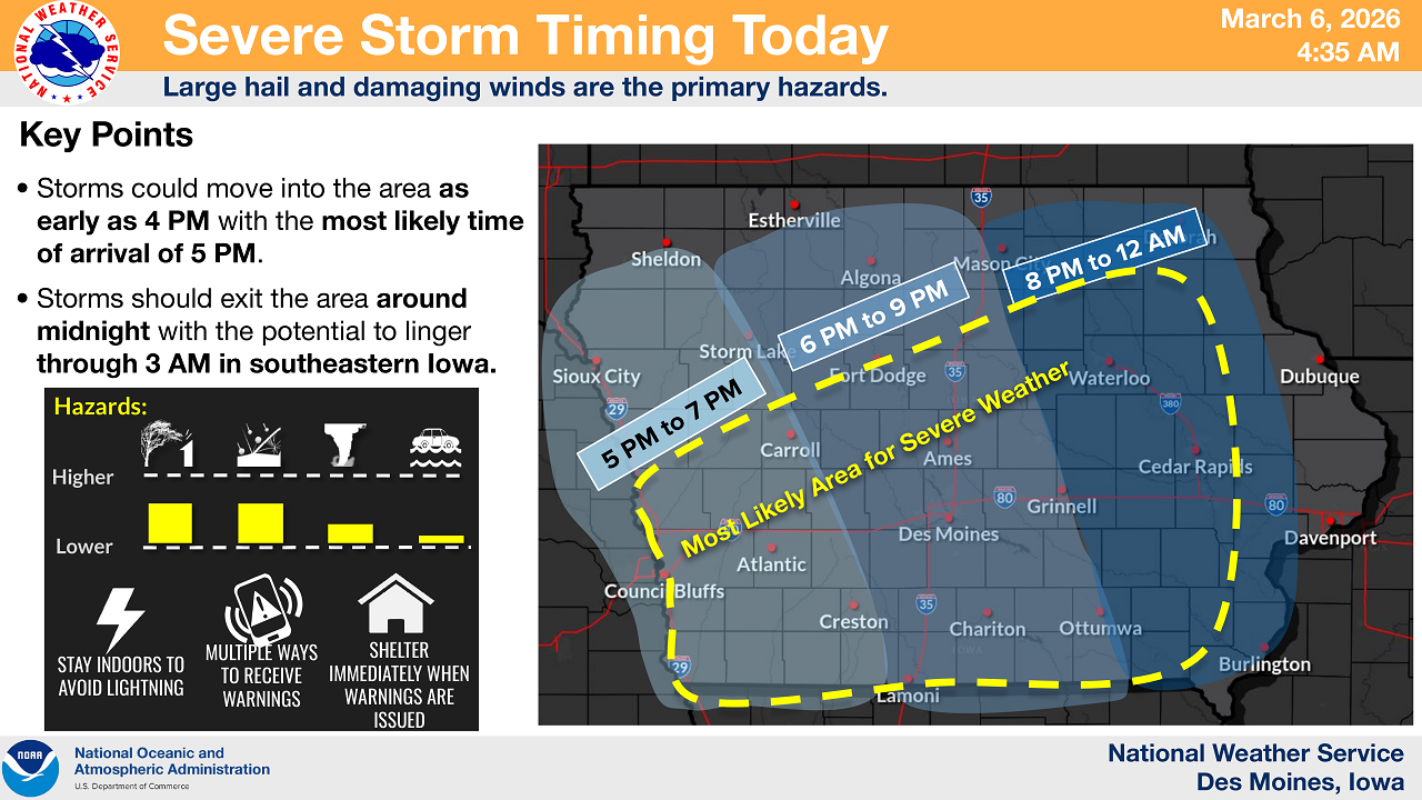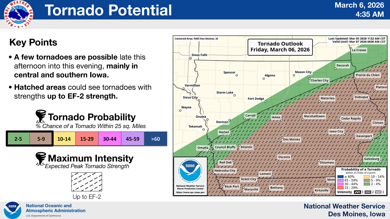 In addition to wind and hail, forecasters say a few tornadoes could develop, particularly across central and southern Iowa during the late afternoon and evening hours. Some storms may have the potential to produce tornadoes up to EF-2 strength.