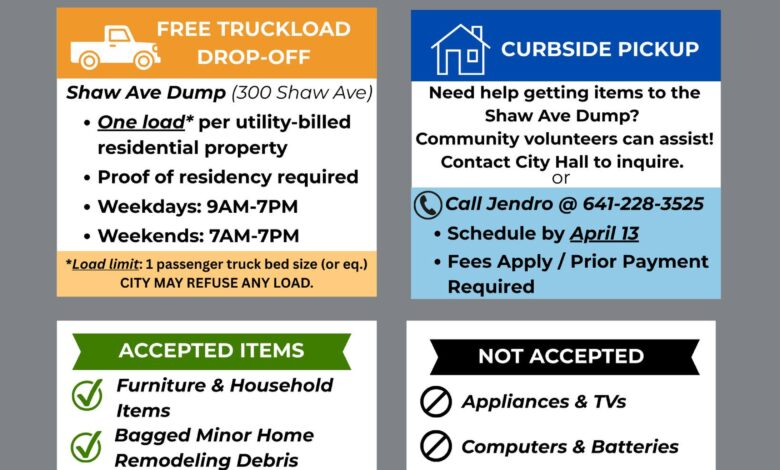 Check the City website with additional details, including accepted items, disposal options, and other helpful resources, or call City Hall at 641-257-6300.